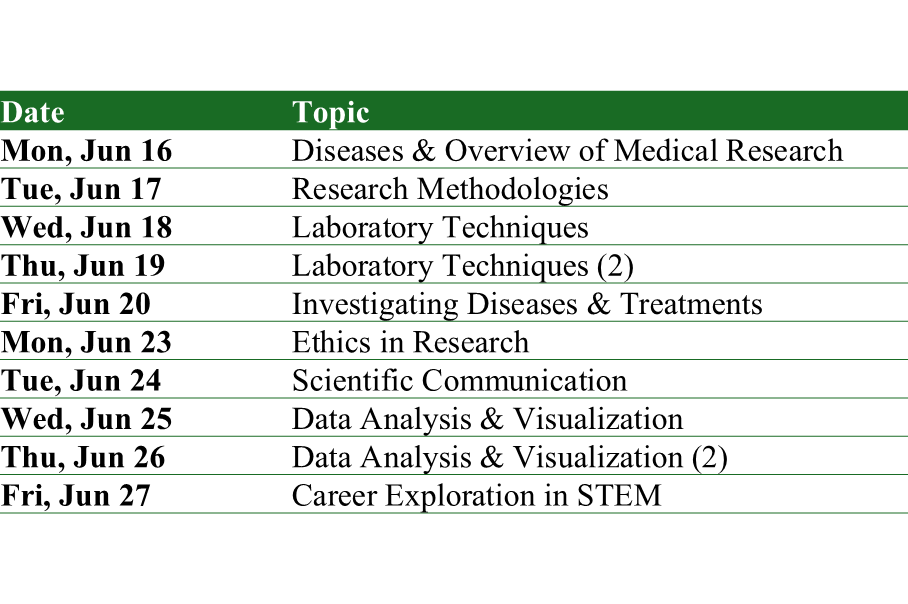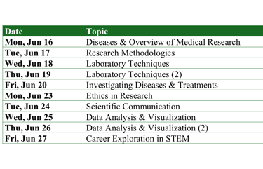 Through lectures, hands-on activities, and interactive discussions, you’ll step beyond traditional classroom learning to explore medical research. Whether you're interested in scientific discovery, healthcare, or medical technology, this program provides an invaluable opportunity to expand your knowledge and envision your future in the field.